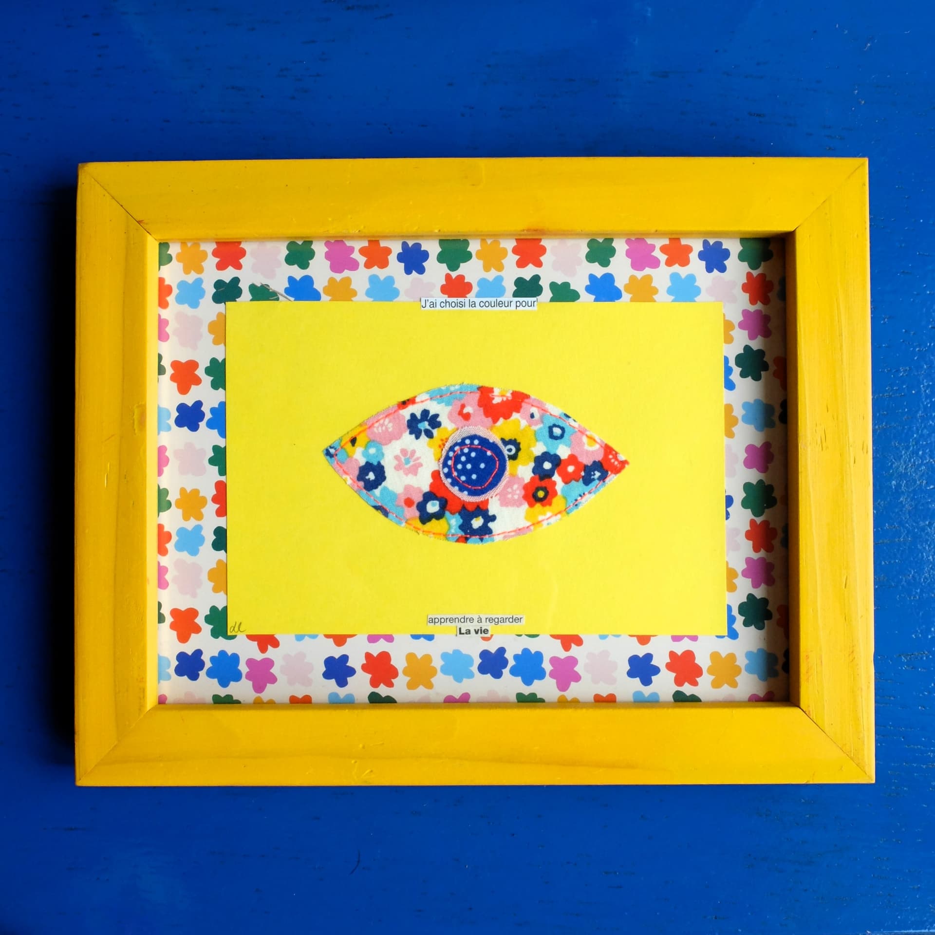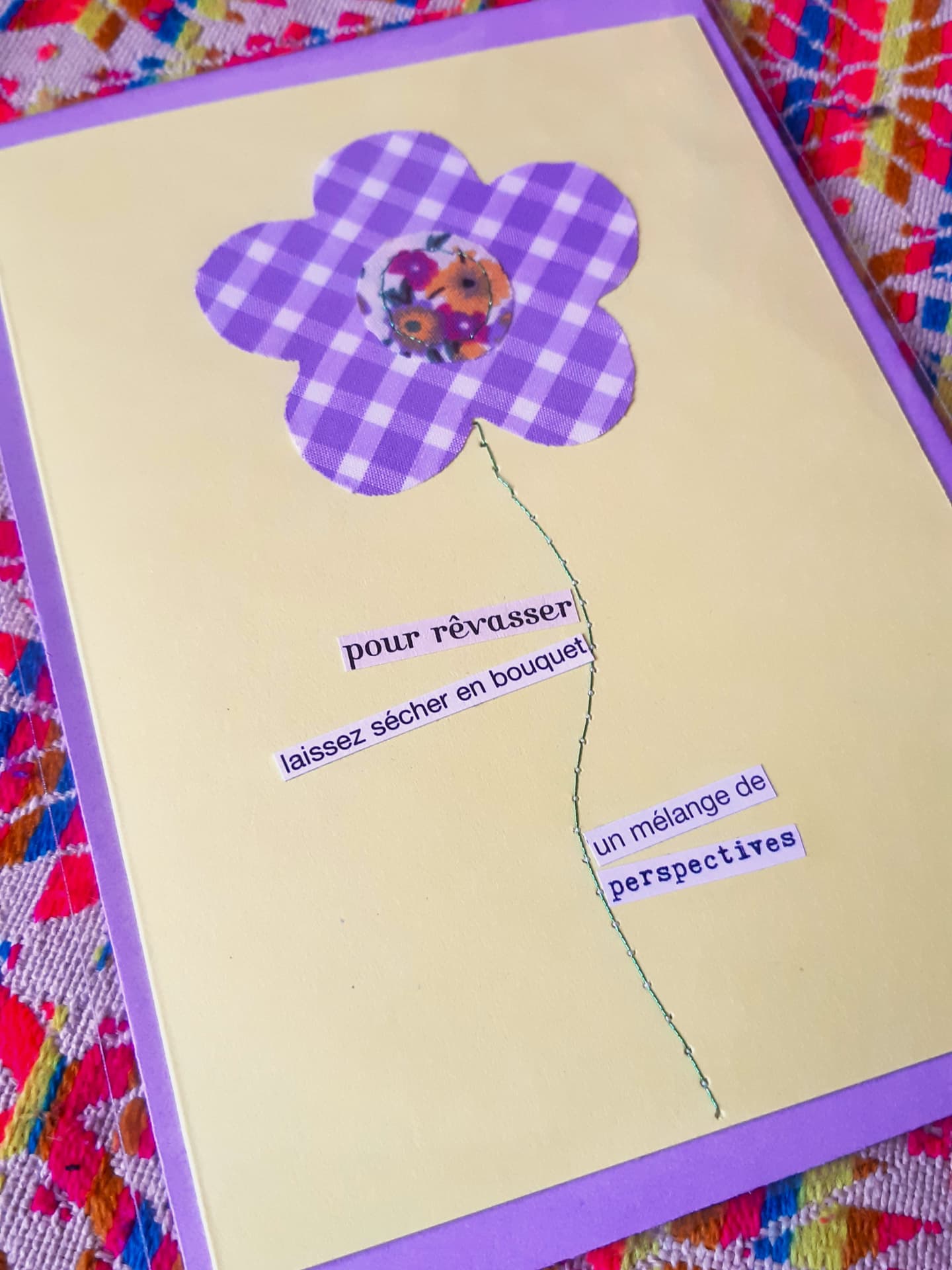 La collection artisanale se compose de modèles uniques conçus à partir de chutes de tissu cousues sur papier, de mots et papiers découpés dans de vieux livres dans une démarche upcycling et un esprit "collage". Cartes cousues artisanales, cartes-poèmes et cadres-poèmes, badges à messages ou en tissu, enveloppes explorent des thématiques comme la nature, le féminisme, le quotidien. Les courts poèmes qui soulignent ces images sont autant empreints de douceur de vivre que d'humour absurde.
