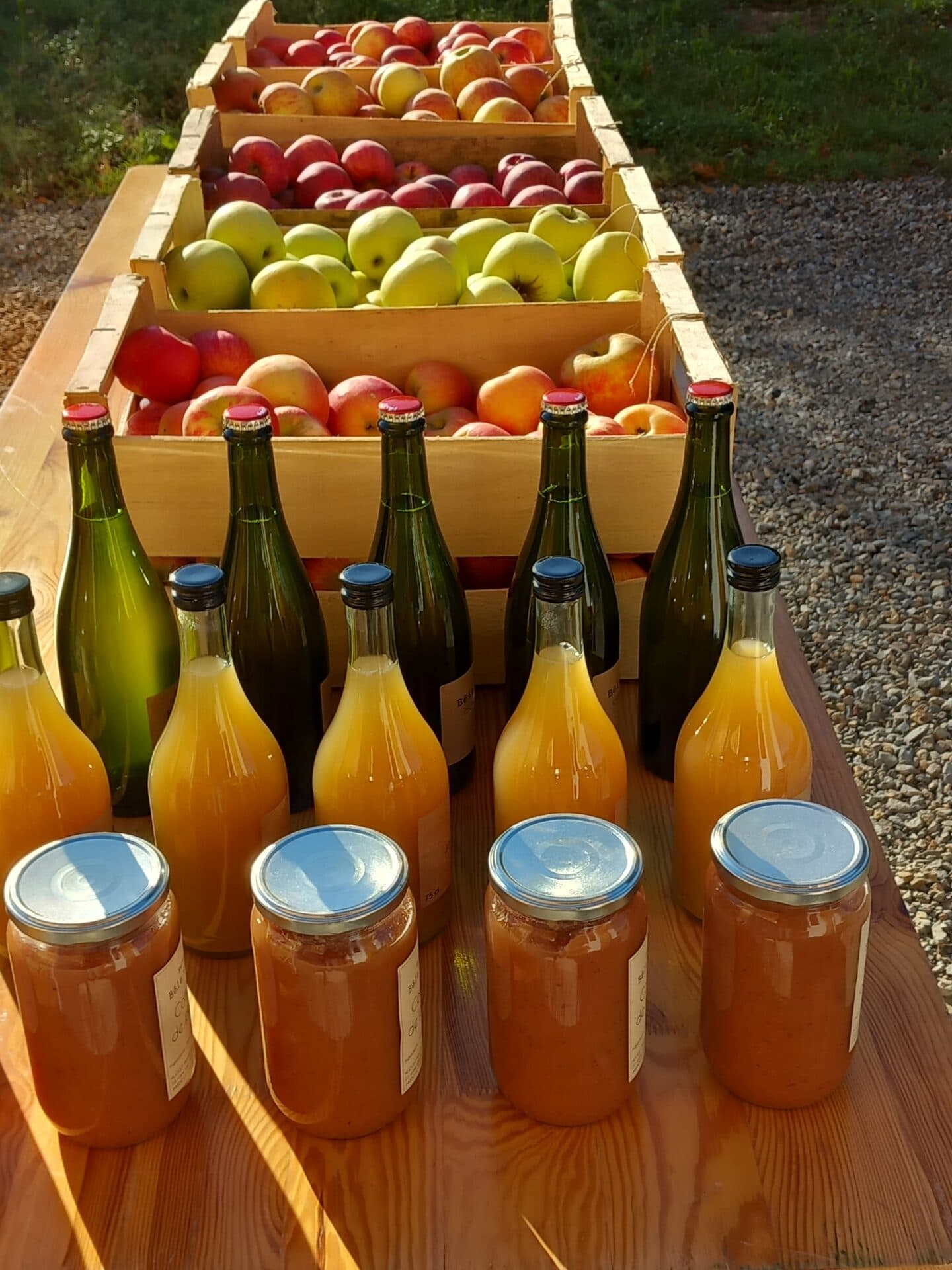 Les vergers sont en troisième année de conversion bio. J'y cultive une dizaine de variétés de pommes à couteau et à cidre. Une partie des pommes est transformée en jus, cidre et compote. N'ayant pas de chambre froide pour les pommes, celles-ci ne sont à la vente que de septembre à décembre. A l'automne, une fois la cueillette terminée, les vergers sont pâturés par les brebis.